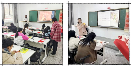 折纸环节,纸艺社指导教师高佳丽老师以彩纸演绎“指尖生花”的魔法,细致讲解立体玫瑰制作流程。层叠的褶皱化为永不凋零的玫瑰,每一瓣都凝聚着柔韧与力量,师生们专注折叠,将祝福与敬意融入作品,这一枝枝玫瑰不仅是伴手礼物,更是对新时代女性‘芳华自成’的致敬。