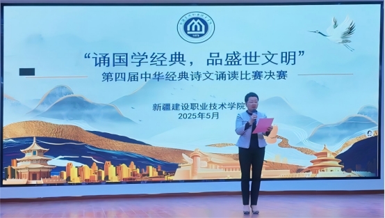 2025年5月28日下午,新疆建设职业技术学院在建材校区大礼堂举办第四届“诵国学经典,品盛世文明”中华经典诗文诵读比赛。学院党委副书记、院长党进,党委副书记、副院长马桂珍,副院长余冬贞等领导出席,评委老师、个人赛选手、团体赛师生队伍、公共教学部书香社成员及各二级学院(部)师生代表共同参与。